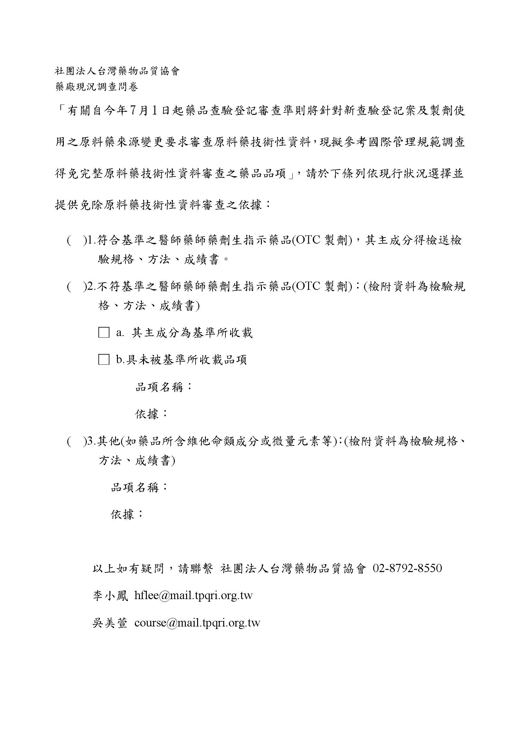 【來函轉知】TPQRI:藥廠現況調查問卷